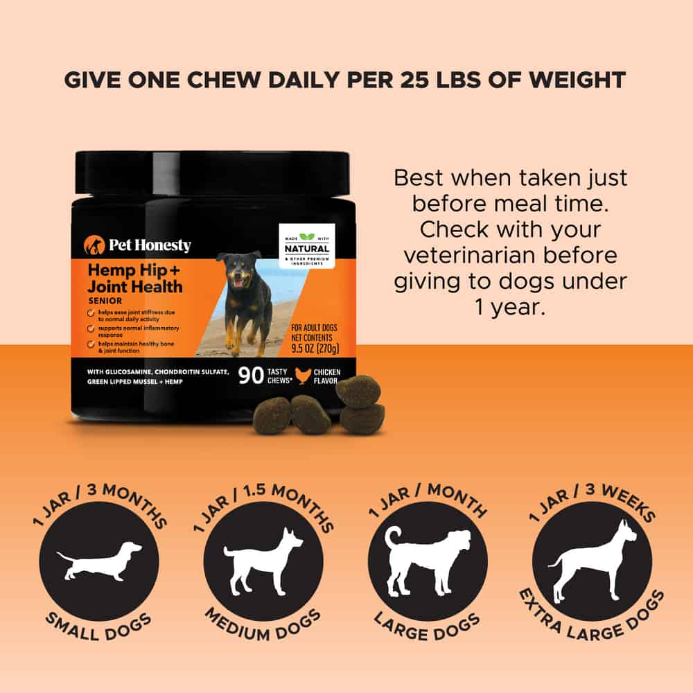 Pet Honesty Hemp Hip + Joint Health Senior Chicken Flavored Soft Chew Hip and Joint Supplement for Senior Dogs Directions: