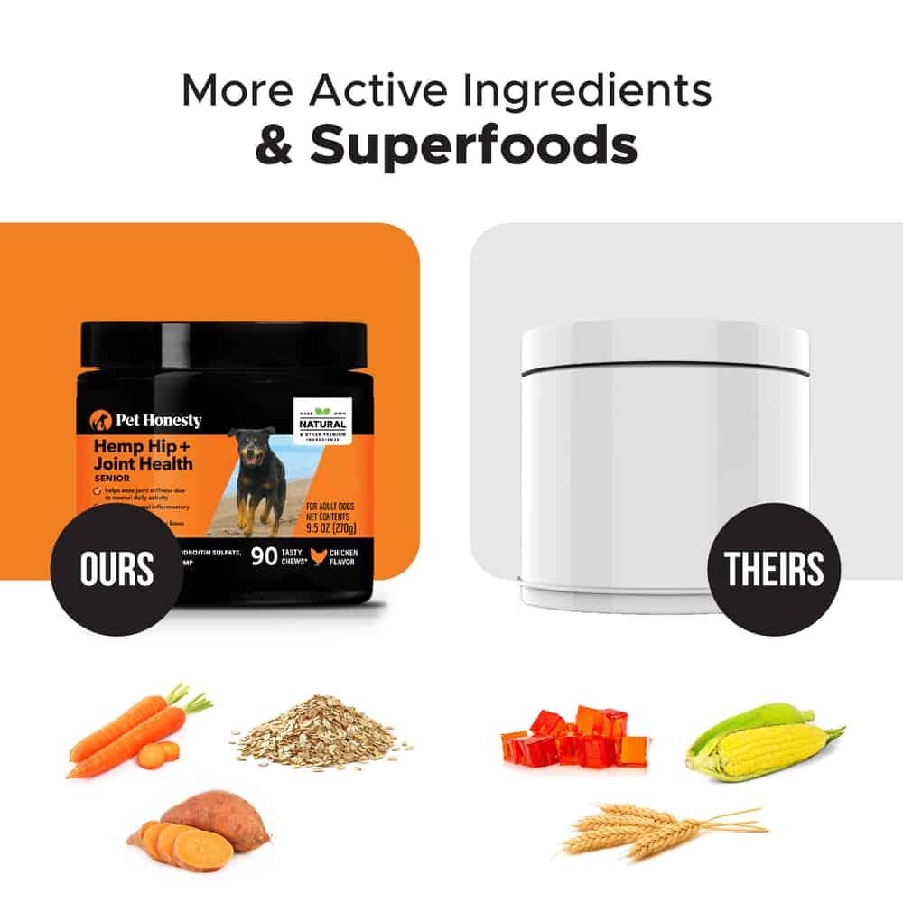 Pet Honesty Hemp Hip + Joint Health Senior Chicken Flavored Soft Chew Hip and Joint Supplement for Seniors eases joint stiffness due to normal daily exercise, while enhancing healthy joint fluid viscosity