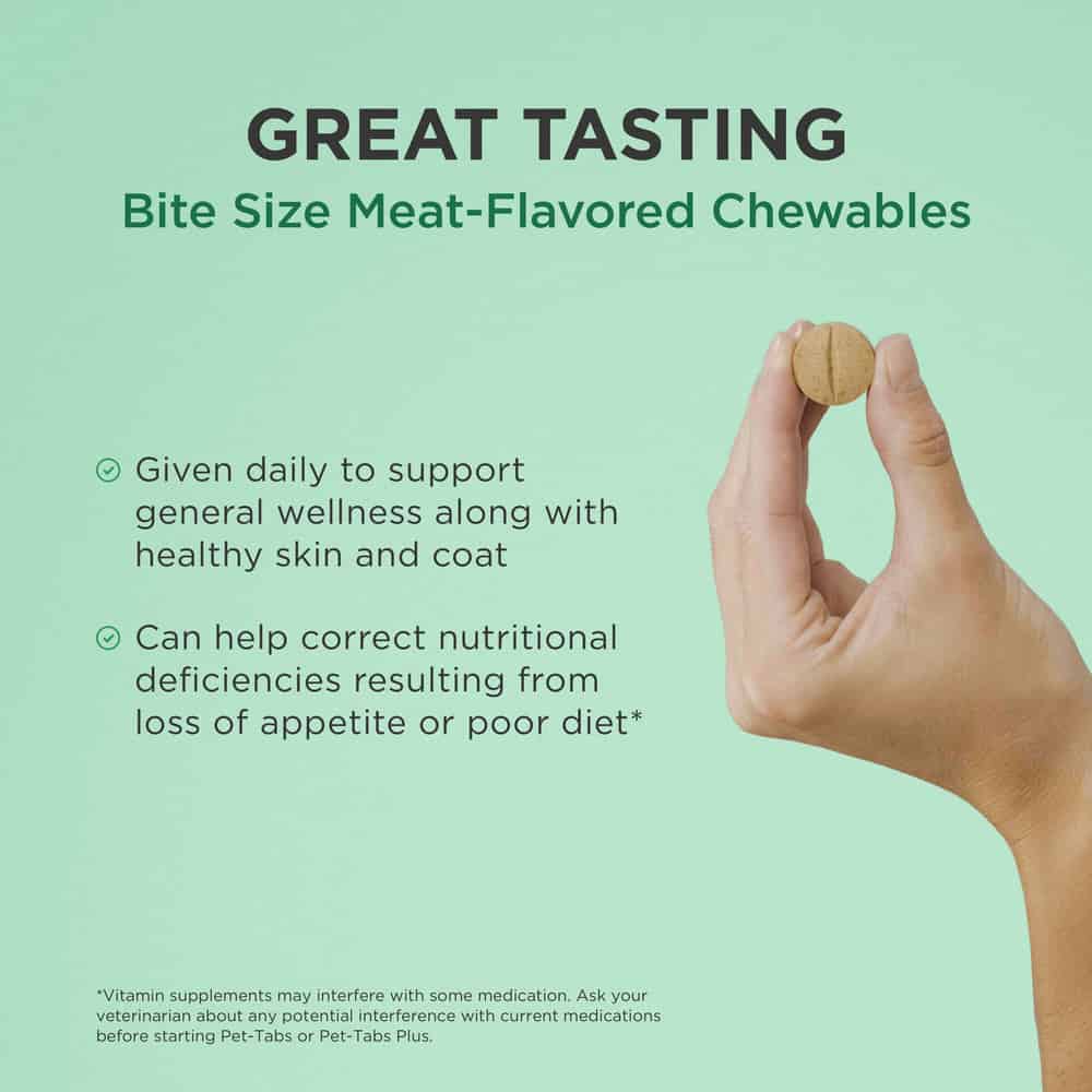 Pet-Tabs are vitamin and mineral supplement tablets for dogs, containing 17 essential vitamins and minerals. Given daily, this highly palatable meat-flavored tablet will help maintain your dog's nutritional balance. Pet-Tabs are a tasty way to help correct nutritional deficiencies resulting from loss of appetite or a poor diet.
