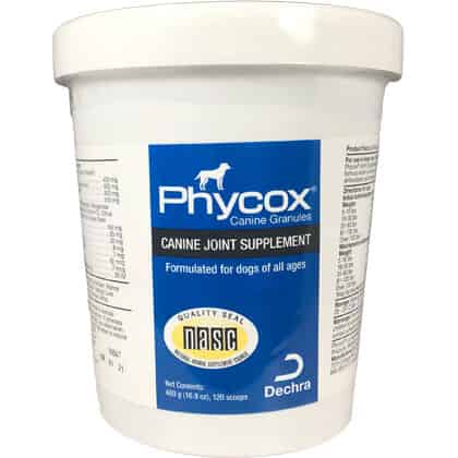 Phycox® is a joint supplement to help reduce inflammation and discomfort due to normal daily activity. It is available as Phycox Soft Chews, Phycox HypoAllergenic Soft Chews, Phycox Small Bites for small dogs under 30 lbs, and Phycox Granules. Each formulation of Phycox contains a natural source of phycocyanin, an extract of blue-green algae offering joint support and stress relief. If your dog has allergies, use Phycox HA HypoAllergenic, which contains no mammalian protein (no natural liver flavor).