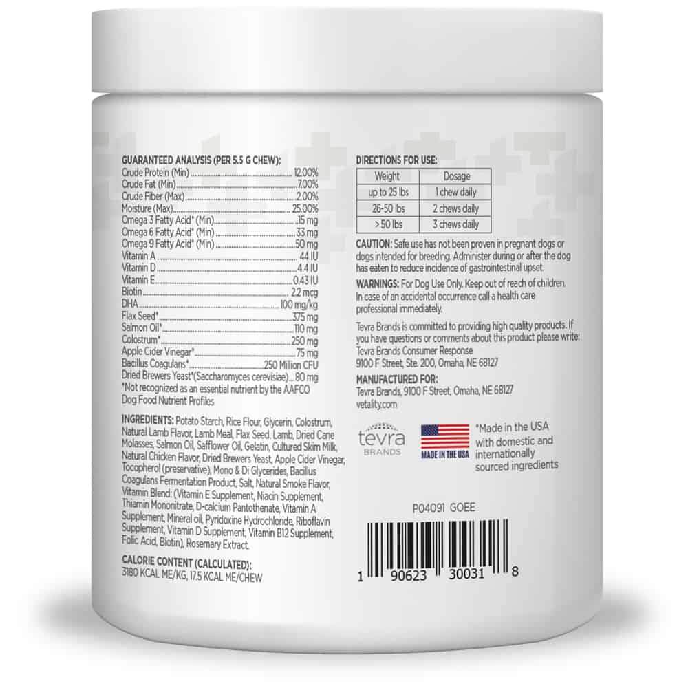 TevraPet Triple Action Skin& Coat Soft Chews formula provides a solution to healthy skin, coat and tuff pads for your dog. It also contains ground flaxseed to provide omega-3 fatty acids, plus vitamins A, D and E to support skin and coat repair and protection.
