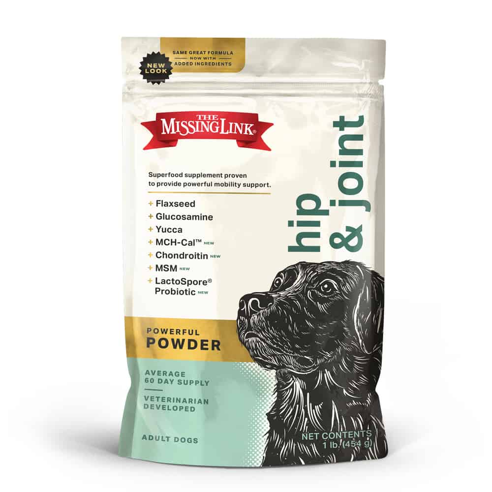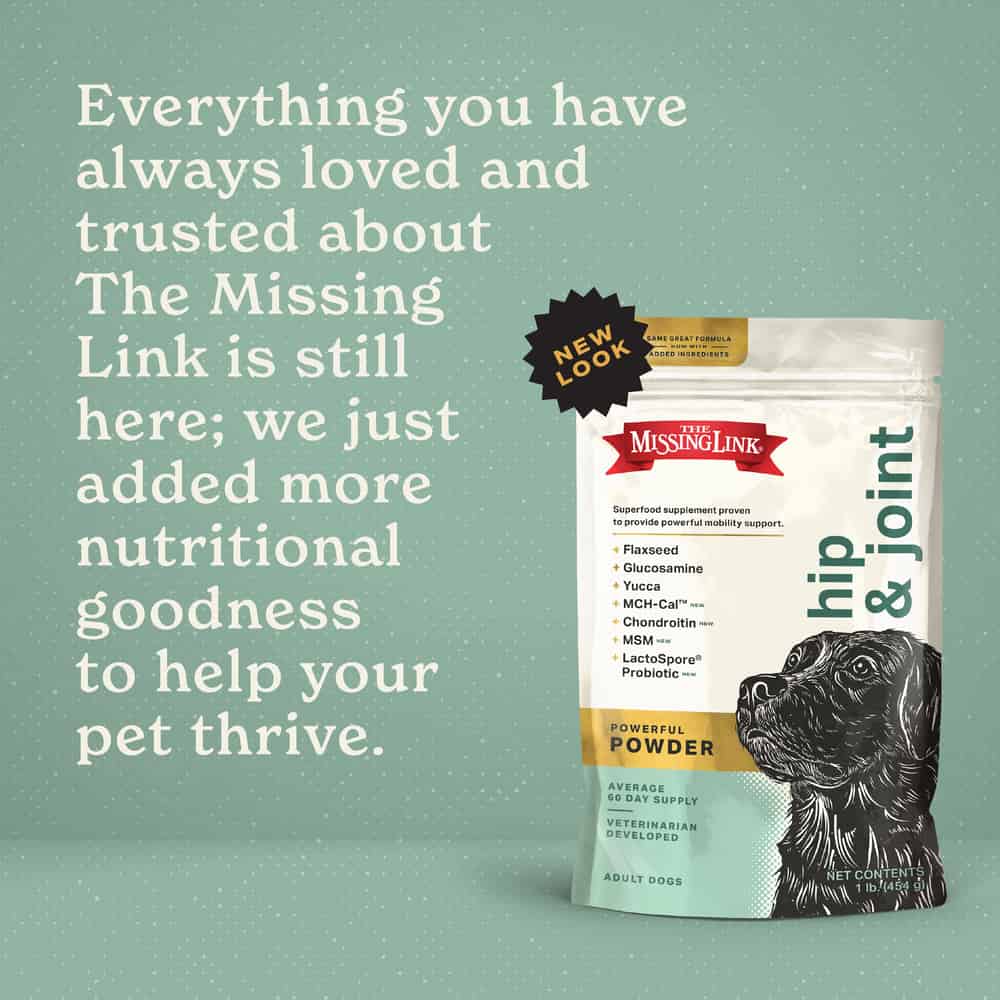 The Missing Link’s newly enhanced formula delivers power, purity and performance in each scoop to help dogs live their best lives ever. A powerful blend of high-quality ingredients promotes cartilage development, joint mobility, flexibility, helps support optimal bone health, and eases joint stiffness.