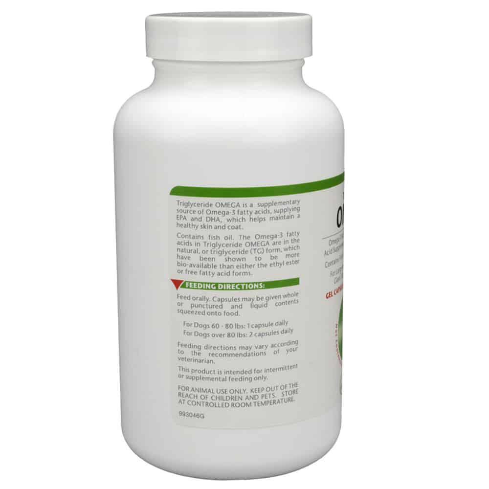 Triglyceride Omega for dogs and cats supplies EPA and DHA omega-3 fatty acids, which helps maintain a healthy skin and coat. Omega-3 fatty acids are also used to support kidney and heart function and may also support joint health.