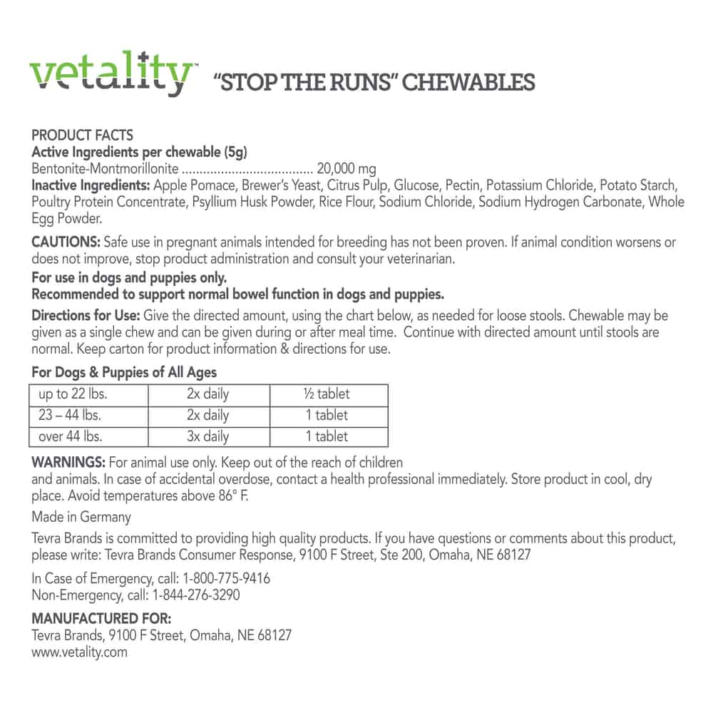 Vetality® 'Stop the Runs' Chewables helps turn dog stools from loose to firm. This fast-acting, all-natural, easy-to-use chewable, is optimized for taste and made of a complex composition of natural extracts to help regulate gut activity. Tested & recommended by veterinarians. Perfect for travel & diet changes. For dog & puppies of all ages & sizes. -Pectin & Bentonite helps bind liquids to firm stools -Prebiotics help support growth of good bacteria-Electrolytes help balance fluid loss-Nutrients help provide available energy Safe for dogs & puppies of all ages. Easy to use and optimized for taste (chicken-apple flavored). Perfect for travel & diet change.