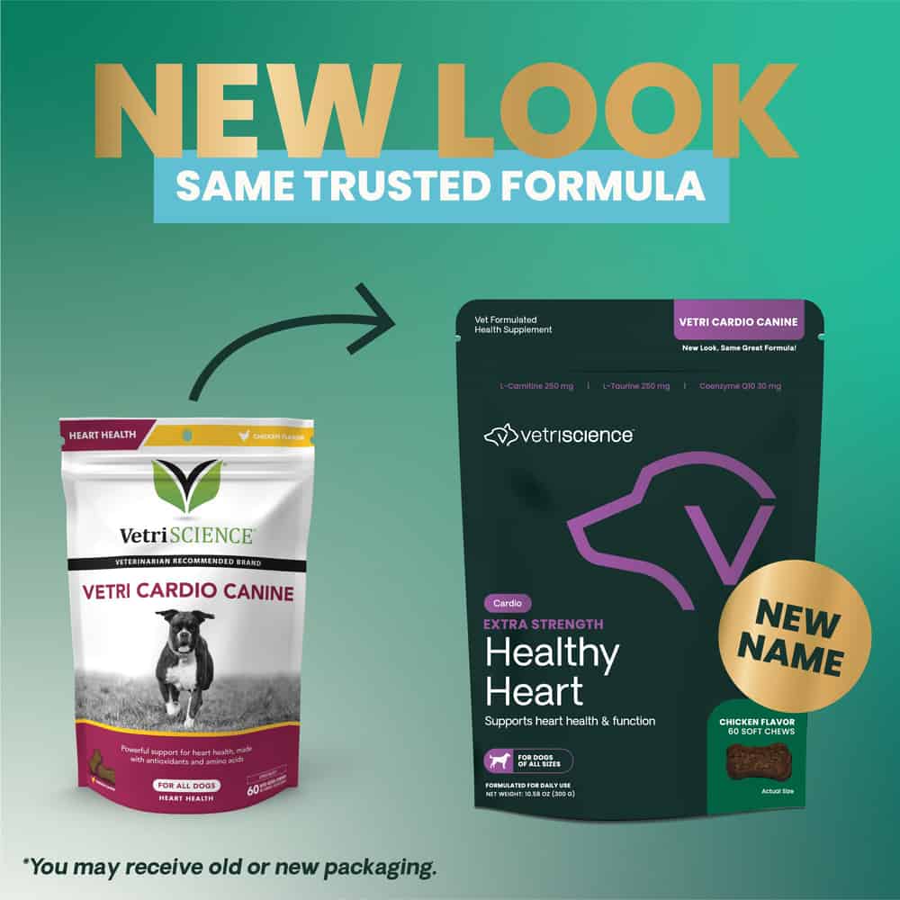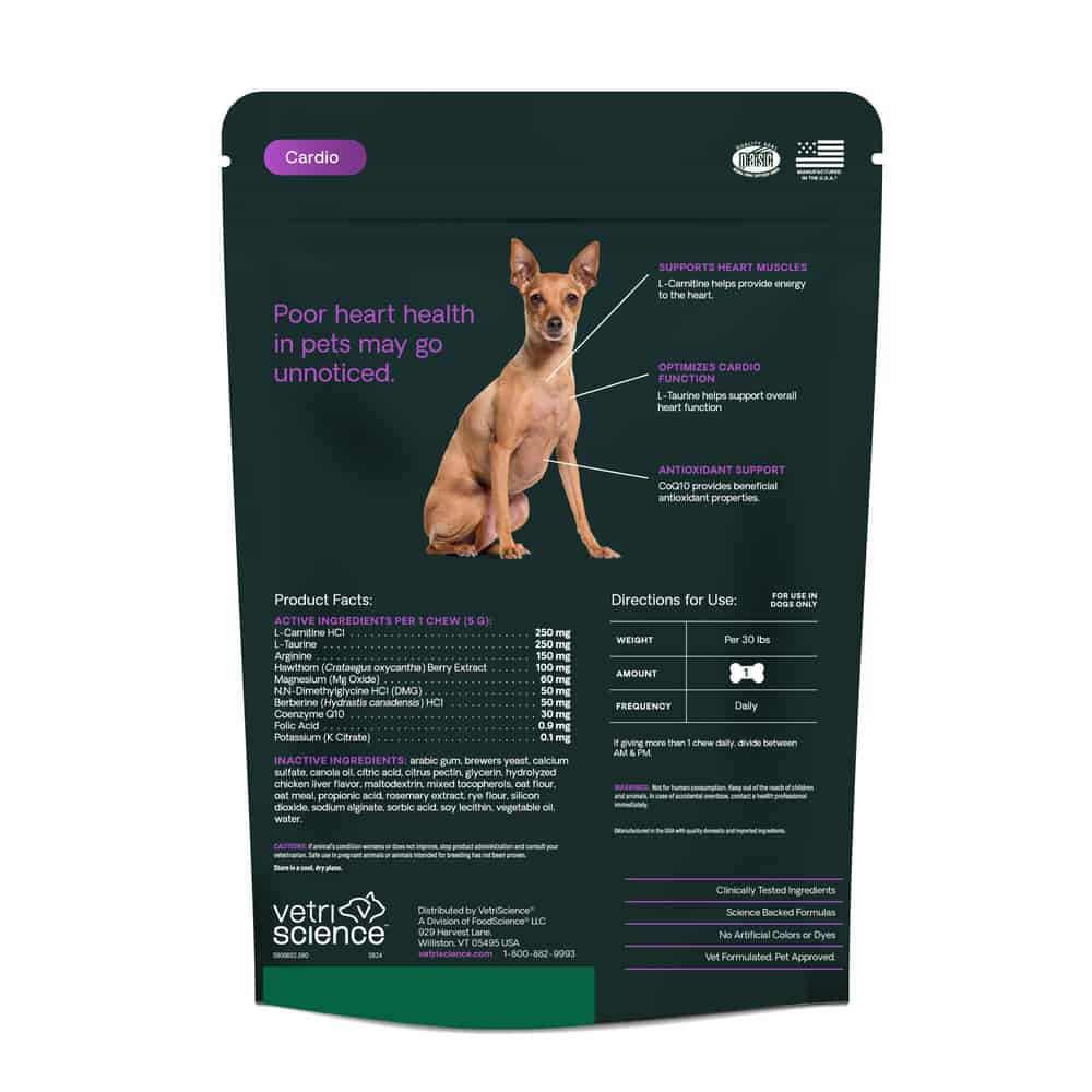 - VetriScience Vetri Cardio Canine Bite-Sized Chews for Dogs are recommended to support cardiovascular health in dogs of all weights.