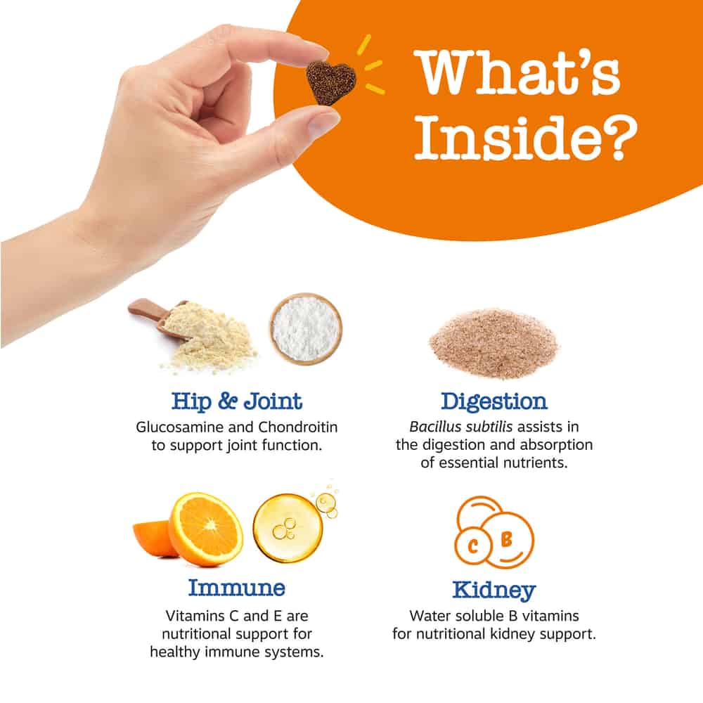 • 11 in 1 Bites are soft chews with ingredients that support performance, hips & joints, heart, immunity, urinary tract, skin, brain, eye, liver, and gut health.
