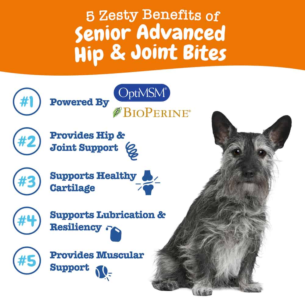 - Deluxe Joint Support – Senior Advanced Hip & Joint Bites are functional supplements that support joints, cartilage, connective tissue, and muscular function for any small, medium, or large breed.