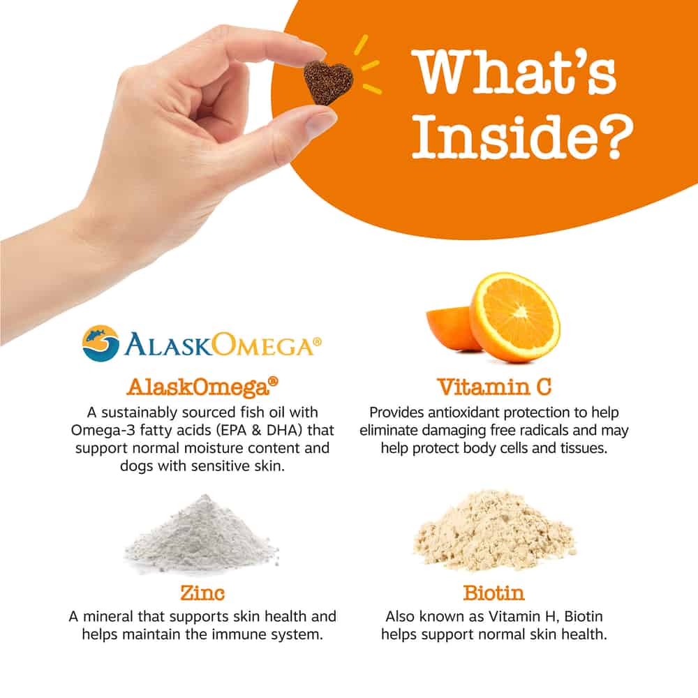 - Chicken-flavored chews with vitamins, minerals, and omegas to help maintain healthy skin and reduce itching.