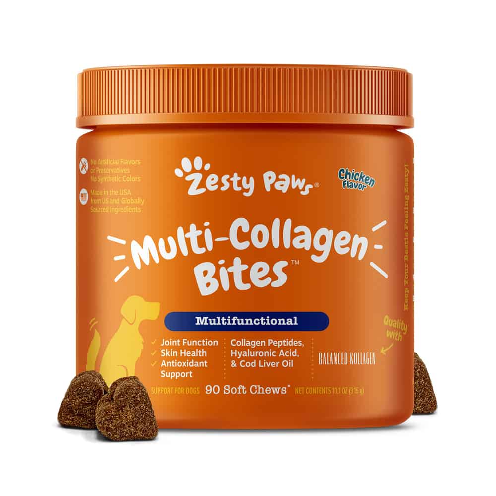 Zesty Paws Multi-Collagen Bites are soft chews for dogs that support joint mobility, cartilage health, and skin wellness. Each chew features Balanced Kollagen from eggshell membrane, along with collagen peptides, cod liver oil, vitamin C, and hyaluronic acid. These ingredients work together to maintain healthy connective tissues and promote overall vitality.