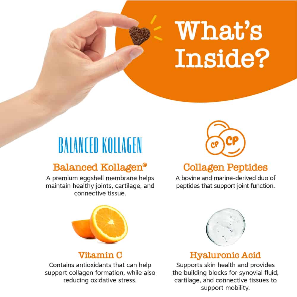 Supports joint, cartilage, and connective tissue health with five types of collagen. Balanced Kollagen® eggshell membrane promotes flexibility, while collagen peptides from bovine and fish sources maintain joint function. Hyaluronic acid provides building blocks for synovial fluid and cartilage, helping dogs of all ages stay active and comfortable.