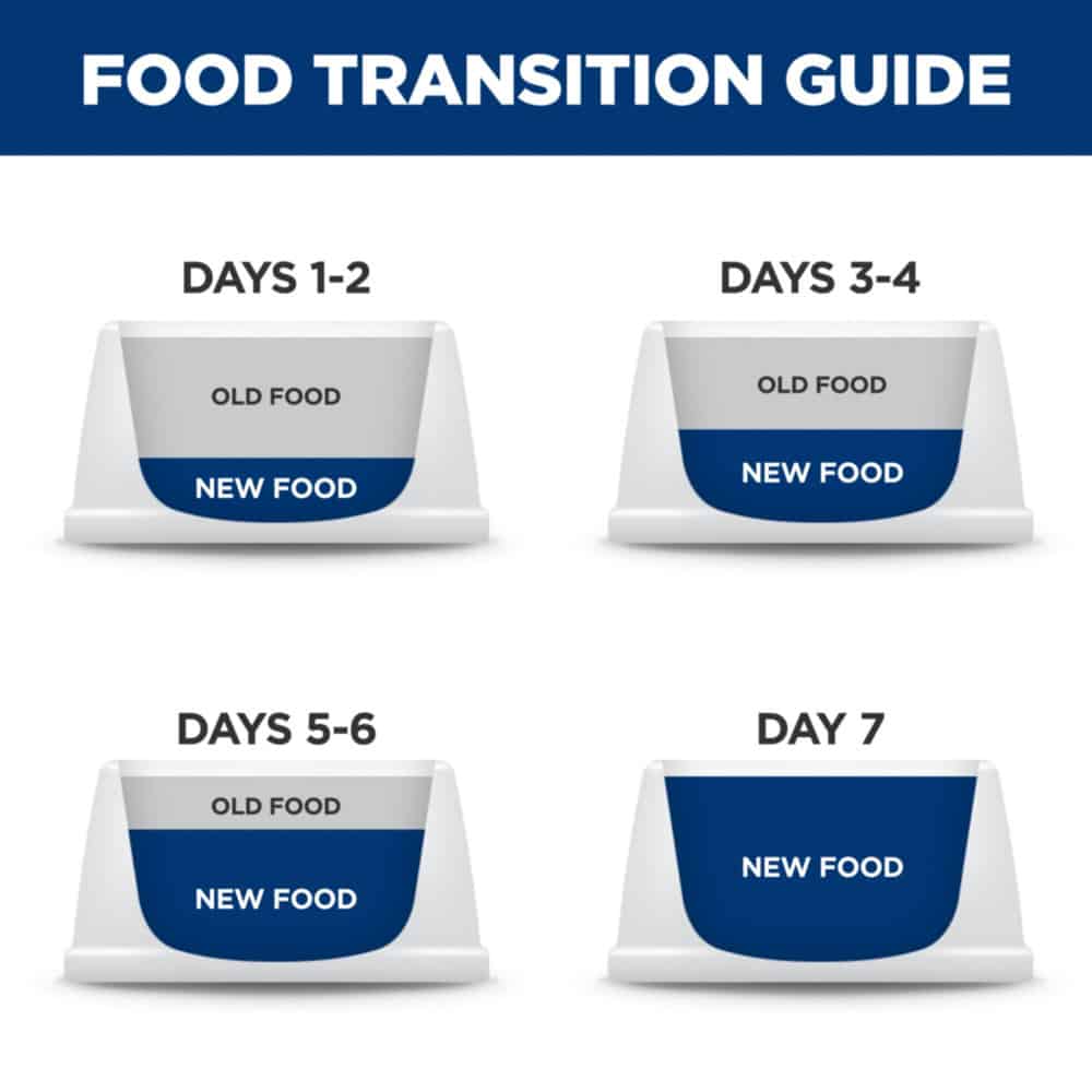 - New to this food? Mix increasing amounts of your pet's new food with decreasing amounts of the old food for 7 days or more.