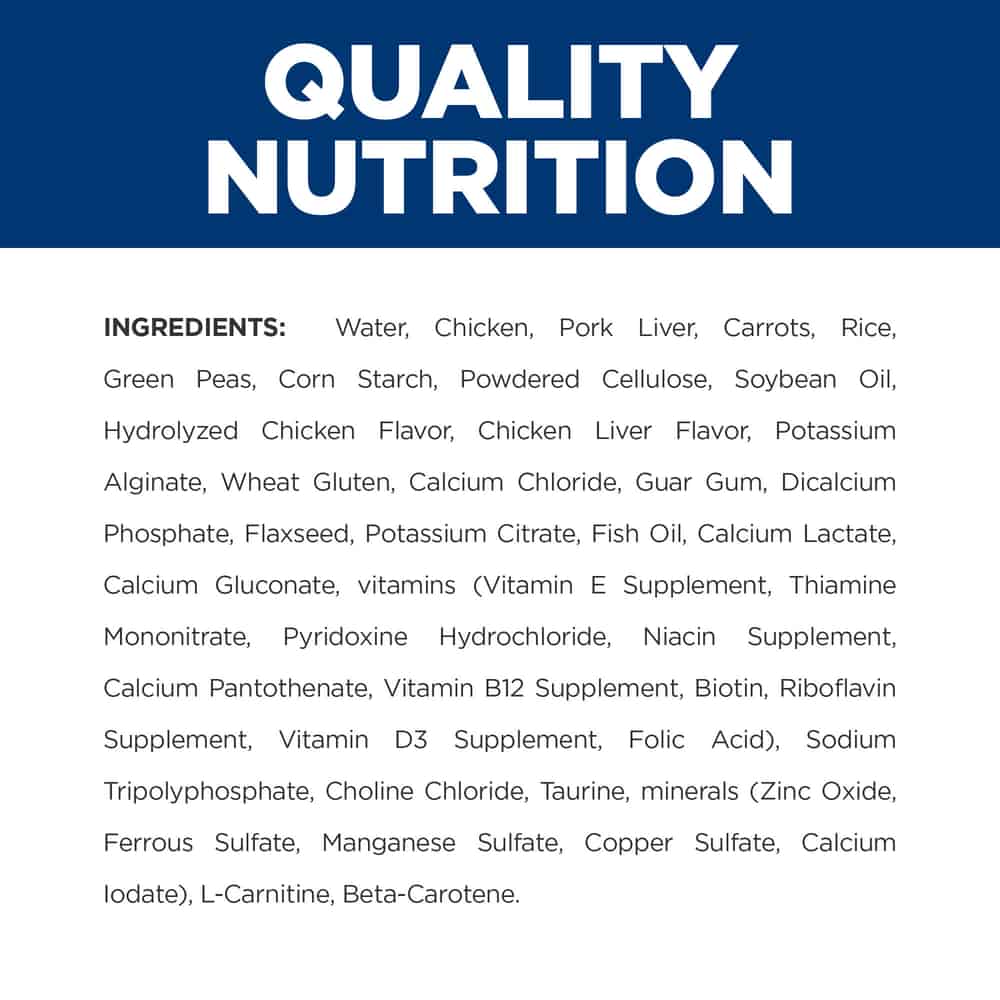 | Water, Chicken, Pork Liver, Carrots, Rice, Green Peas, Corn Starch, Powdered Cellulose, Soybean Oil, Hydrolyzed Chicken Flavor, Chicken Liver Flavor, Potassium Alginate, Wheat Gluten, Calcium Chloride, Guar Gum, Dicalcium Phosphate, Flaxseed, Potassium Citrate, Fish Oil, Calcium Lactate, Calcium Gluconate, vitamins (Vitamin E Supplement, Thiamine Mononitrate, Pyridoxine Hydrochloride, Niacin Supplement, Calcium Pantothenate, Vitamin B12 Supplement, Biotin, Riboflavin Supplement, Vitamin D3 Supplement, Folic Acid), Sodium Tripolyphosphate, Choline Chloride, Taurine, minerals (Zinc Oxide, Ferrous Sulfate, Manganese Sulfate, Copper Sulfate, Calcium Iodate), L-Carnitine, Beta-Carotene. |