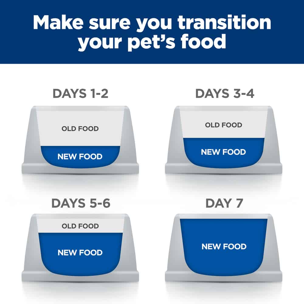 - New to this food? Mix increasing amounts of your pet's new food with decreasing amounts of the old food for 7 days or more.