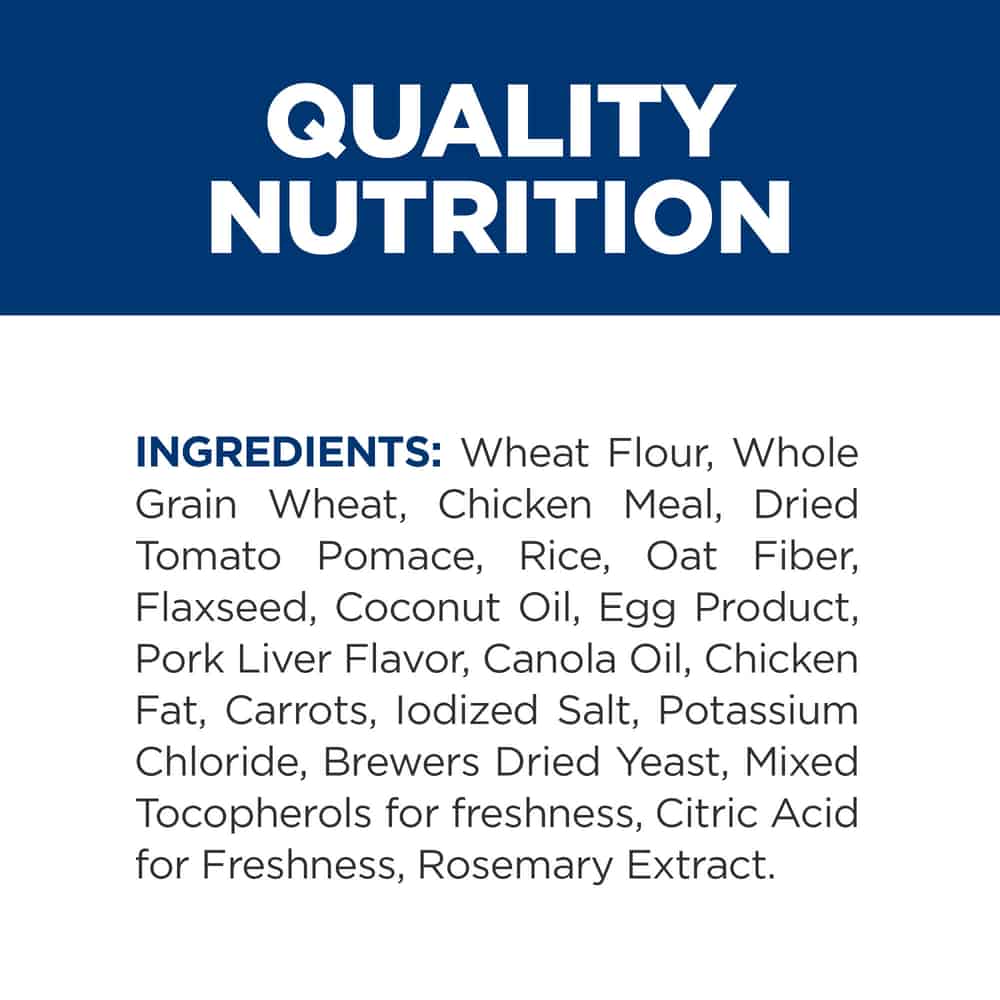 | Wheat Flour, Whole Grain Wheat, Chicken Meal, Dried Tomato Pomace, Rice, Oat Fiber, Flaxseed, Coconut Oil, Egg Product, Pork Liver Flavor, Canola Oil, Chicken Fat, Carrots, Iodized Salt, Potassium Chloride, Brewers Dried Yeast, Mixed Tocopherols for freshness, Citric Acid for Freshness, Rosemary Extract. |