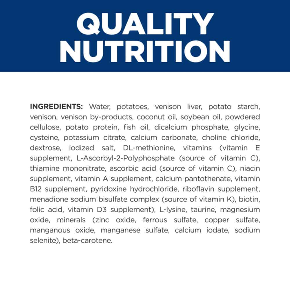 | Water, potatoes, venison liver, potato starch, venison, venison by-products, coconut oil, soybean oil, powdered cellulose, potato protein, fish oil, dicalcium phosphate, glycine, cysteine, potassium citrate, calcium carbonate, choline chloride, dextrose, iodized salt, DL-methionine, vitamins (vitamin E supplement, L-Ascorbyl-2-Polyphosphate (source of vitamin C), thiamine mononitrate, ascorbic acid (source of vitamin C), niacin supplement, vitamin A supplement, calcium pantothenate, vitamin B12 supplement, pyridoxine hydrochloride, riboflavin supplement, menadione sodium bisulfate complex (source of vitamin K), biotin, folic acid, vitamin D3 supplement), L-lysine, taurine, magnesium oxide, minerals (zinc oxide, ferrous sulfate, copper sulfate, manganous oxide, manganese sulfate, calcium iodate, sodium selenite), beta-carotene. |
