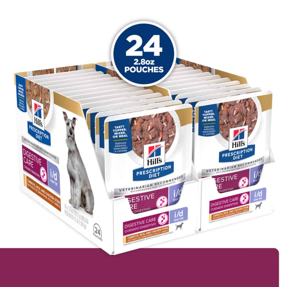 - Hill's Prescription Diet i/d Low Fat Digestive Care Carrots, Chicken and Rice Stew Pouch Dog Food is specially formulated by Hill’s nutritionists and veterinarians to support dogs' digestive health