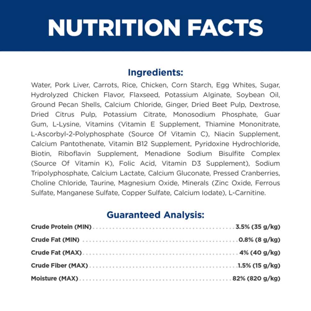 | Water, Pork Liver, Carrots, Rice, Chicken, Corn Starch, Egg Whites, Sugar, Hydrolyzed Chicken Flavor, Flaxseed, Potassium Alginate, Soybean Oil, Ground Pecan Shells, Calcium Chloride, Ginger, Dried Beet Pulp, Dextrose, Dried Citrus Pulp, Potassium Citrate, Monosodium Phosphate, Guar Gum, L-Lysine, Vitamins (Vitamin E Supplement, Thiamine Mononitrate, L-Ascorbyl-2-Polyphosphate (Source Of Vitamin C), Niacin Supplement, Calcium Pantothenate, Vitamin B12 Supplement, Pyridoxine Hydrochloride, Biotin, Riboflavin Supplement, Menadione Sodium Bisulfite Complex (Source Of Vitamin K), Folic Acid, Vitamin D3 Supplement), Sodium Tripolyphosphate, Calcium Lactate, Calcium Gluconate, Pressed Cranberries, Choline Chloride, Taurine, Magnesium Oxide, Minerals (Zinc Oxide, Ferrous Sulfate, Manganese Sulfate, Copper Sulfate, Calcium lodate), L-Carnitine. |