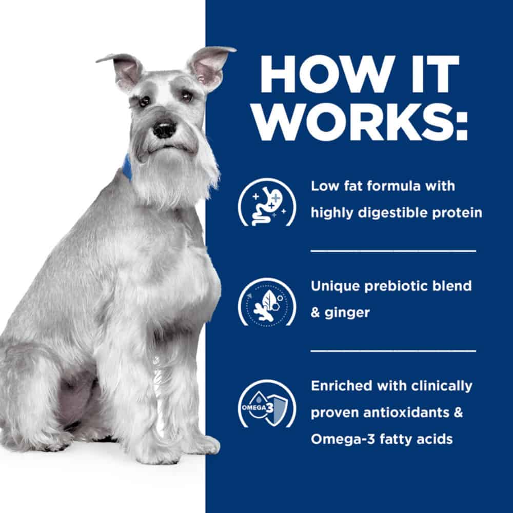 Hill's Prescription Diet i/d Low Fat Digestive Care Carrot, Chicken, & Rice Stew Recipe Wet Dog Food works by utilizing a low-fat, highly digestible formula to improve digestion and nutrient absorption. It contains a unique prebiotic blend, ginger, and omega-3 fatty acids to promote beneficial gut bacteria, improve stool quality, and support a healthy immune system.