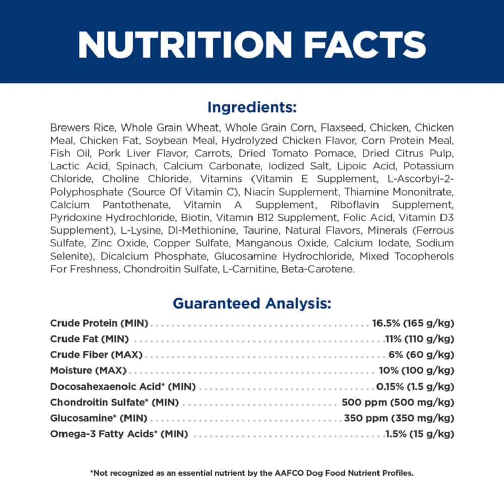 | Brewers Rice, Whole Grain Wheat, Whole Grain Corn, Flaxseed, Chicken, Chicken Meal, Chicken Fat, Soybean Meal, Hydrolyzed Chicken Flavor, Corn Protein Meal, Fish Oil, Pork Liver Flavor, Carrots, Dried Tomato Pomace, Dried Citrus Pulp, Lactic Acid, Spinach, Calcium Carbonate, lodized Salt, Lipoic Acid, Potassium Chloride, Choline Chloride, Vitamins (Vitamin E Supplement, L-Ascorbyl-2- Polyphosphate (Source Of Vitamin C), Niacin Supplement, Thiamine Mononitrate, Calcium Pantothenate, Vitamin A Supplement, Riboflavin Supplement, Pyridoxine Hydrochloride, Biotin, Vitamin B12 Supplement, Folic Acid, Vitamin D3 Supplement), L-Lysine, DI-Methionine, Taurine, Natural Flavors, Minerals (Ferrous Sulfate, Zinc Oxide, Copper Sulfate, Manganous Oxide, Calcium lodate, Sodium Selenite), Dicalcium Phosphate, Glucosamine Hydrochloride, Mixed Tocopherols For Freshness, Chondroitin Sulfate, L-Carnitine, Beta-Carotene. |