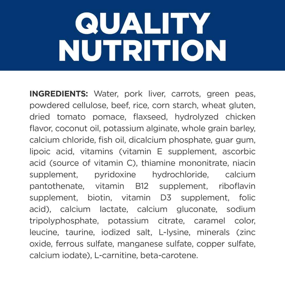 | Water, pork liver, carrots, green peas, powdered cellulose, beef, rice, corn starch, wheat gluten, dried tomato pomace, flaxseed, hydrolyzed chicken flavor, coconut oil, potassium alginate, whole grain barley, calcium chloride, fish oil, dicalcium phosphate, guar gum, lipoic acid, vitamins (vitamin E supplement, ascorbic acid (source of vitamin C), thiamine mononitrate, niacin supplement, pyridoxine hydrochloride, calcium pantothenate, vitamin B12 supplement, riboflavin supplement, biotin, vitamin D3 supplement, folic acid), calcium lactate, calcium gluconate, sodium tripolyphosphate, potassium citrate, caramel color, leucine, taurine, iodized salt, L-lysine, minerals (zinc oxide, ferrous sulfate, manganese sulfate, copper sulfate, calcium iodate), L-carnitine, beta-carotene. |