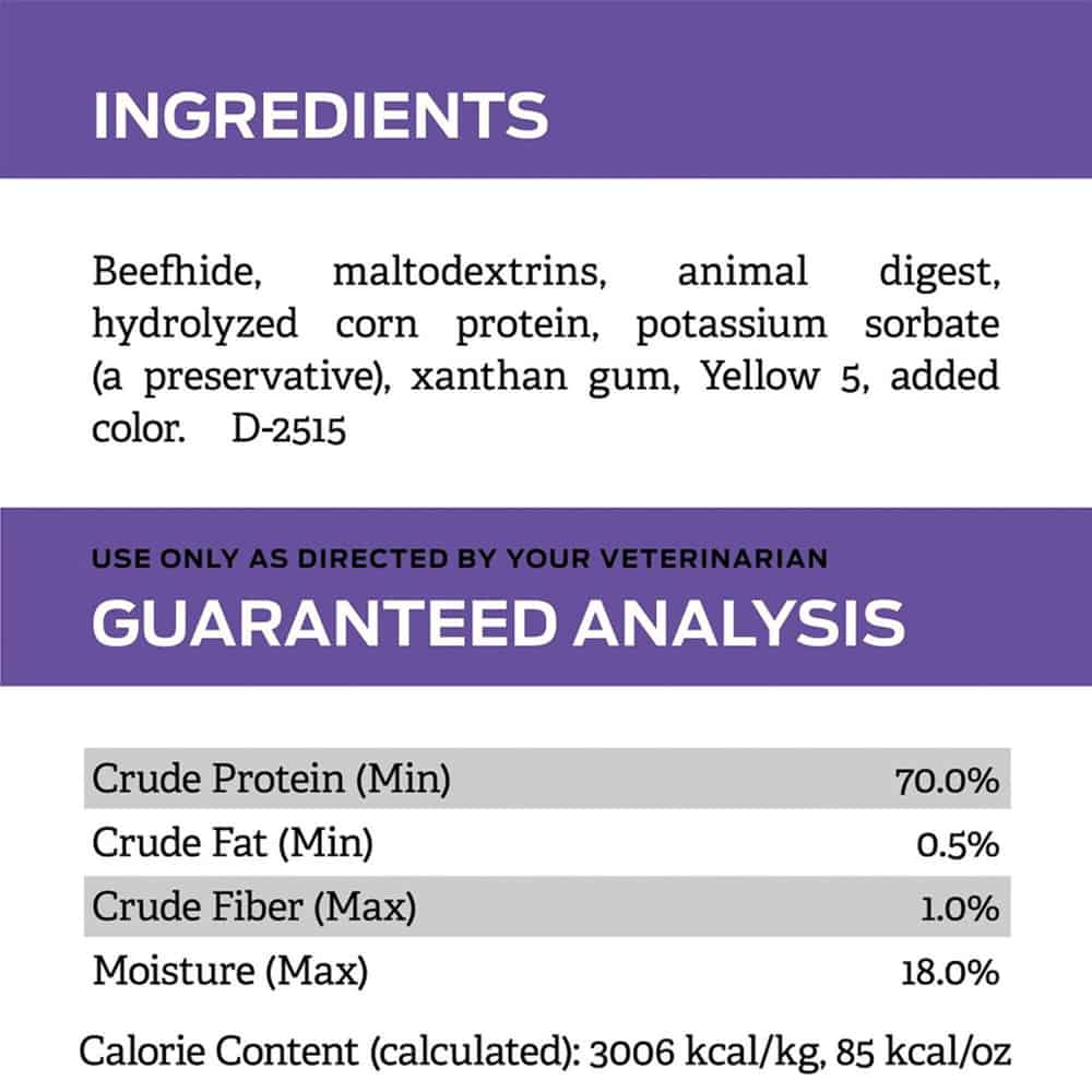 | Beefhide, Maltodextrins, Animal Digest, Hydrolyzed Corn Protein, Dried Yeast, Potassium Sorbate (a Preservative), Xanthan Gum, Yellow 5, Added Color. |