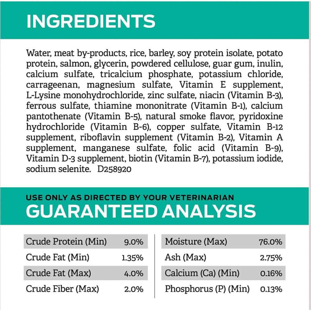 | Water Sufficient For Processing, Rice, Liver, Meat By-Products, Barley, Soy Protein Isolate, Potato Protein, Turkey, Salmon, Glycerin, Powdered Cellulose, Guar Gum, Inulin, Calcium Sulfate, Tricalcium Phosphate, Potassium Chloride, Carrageenan, Magnesium Sulfate, Vitamin E Supplement, Calcium Carbonate, L-Lysine Monohydrochloride, Zinc Sulfate, Niacin (Vitamin B-3), Ferrous Sulfate, Thiamine Mononitrate (Vitamin B-1), Natural Smoke Flavor, Calcium Pantothenate (Vitamin B-5), Pyridoxine Hydrochloride (Vitamin B-6), Copper Sulfate, Vitamin B-12 Supplement, Riboflavin Supplement (Vitamin B-2), Vitamin A Supplement, Manganese Sulfate, Folic Acid (Vitamin B-9), Vitamin D-3 Supplement, Biotin (Vitamin B-7), Potassium Iodide, Sodium Selenite. C-2589 |