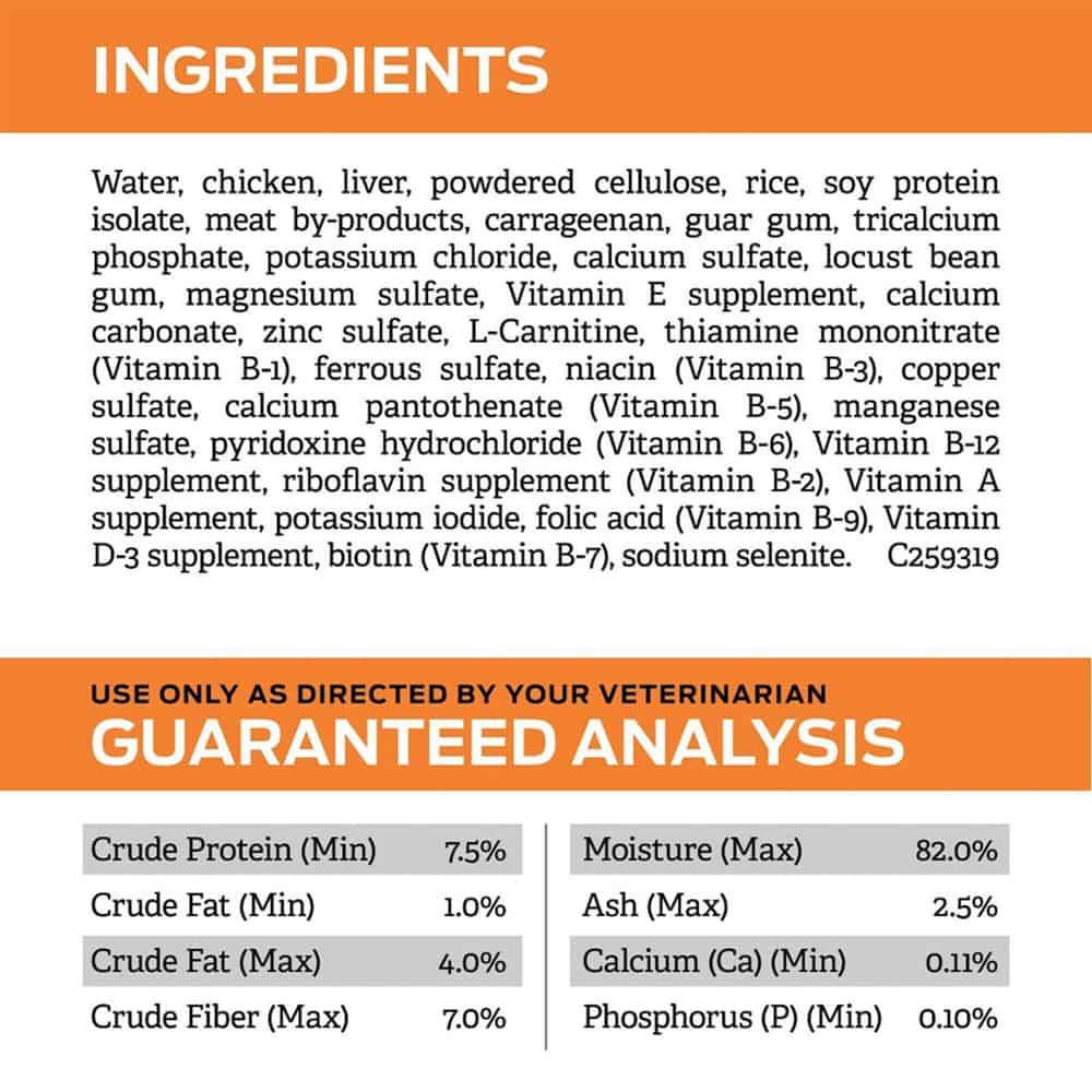 | Water, Chicken, Liver, Powdered Cellulose, Rice, Soy Protein Isolate, Meat By-products, Carrageenan, Guar Gum, Tricalcium Phosphate, Potassium Chloride, Calcium Sulfate, Locust Bean Gum, Magnesium Sulfate, Vitamin E Supplement, Calcium Carbonate, Zinc Sulfate, L-carnitine, Thiamine Mononitrate (Vitamin B-1), Ferrous Sulfate, Niacin (Vitamin B-3), Copper Sulfate, Calcium Pantothenate (Vitamin B-5), Manganese Sulfate, Pyridoxine Hydrochloride (Vitamin B-6), Vitamin B-12 Supplement, Riboflavin Supplement (Vitamin B-2), Vitamin A Supplement, Potassium Iodide, Folic Acid (Vitamin B-9), Vitamin D-3 Supplement, Biotin (Vitamin B-7), Sodium Selenite. C259319 |