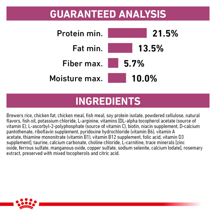 | Brewers rice, chicken fat, chicken meal, fish meal, soy protein isolate, powdered cellulose, natural flavors, fish oil, potassium chloride, L-arginine, vitamins [DL-alpha tocopherol acetate (source of vitamin E), L-ascorbyl-2-polyphosphate (source of vitamin C), biotin, niacin supplement, D-calcium pantothenate, riboflavin supplement, pyridoxine hydrochloride (vitamin B6), vitamin A acetate, thiamine mononitrate (vitamin B1), vitamin B12 supplement, folic acid, vitamin D3 supplement], taurine, calcium carbonate, choline chloride, L-carnitine, trace minerals [zinc oxide, ferrous sulfate, manganous oxide, copper sulfate, sodium selenite, calcium iodate], rosemary extract, preserved with mixed tocopherols and citric acid. |
