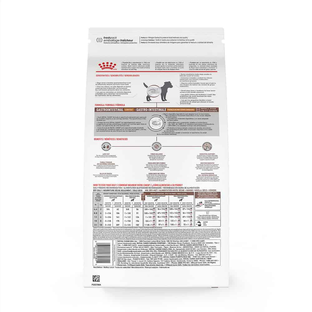 - SMALL DOGS WITH FAT RESTRICTED DIETS: Royal Canin Gastrointestinal Low Fat Small Dog is a veterinary-exclusive dry dog food for small adult dogs under 22 lbs that have difficulties digesting or tolerating fat.