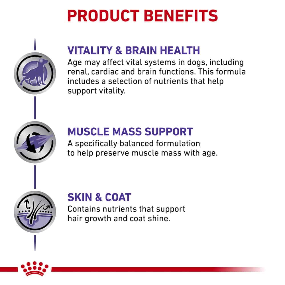 - VITALITY SUPPORT: Contains an exclusive blend of nutrients to support vitality in mature dogs