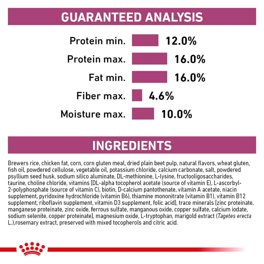 | Brewers rice, chicken fat, corn, corn gluten meal, dried plain beet pulp, natural flavors, wheat gluten, fish oil, powdered cellulose, vegetable oil, potassium chloride, calcium carbonate, salt, powdered psyllium seed husk, sodium silico aluminate, DL-methionine, L-lysine, fructooligosaccharides, taurine, choline chloride, vitamins [DL-alpha tocopherol acetate (source of vitamin E), L-ascorbyl-2-polyphosphate (source of vitamin C), biotin, D-calcium pantothenate, vitamin A acetate, niacin supplement, pyridoxine hydrochloride (vitamin B6), thiamine mononitrate (vitamin B1), vitamin B12 supplement, riboflavin supplement, vitamin D3 supplement, folic acid], trace minerals [zinc proteinate, manganese proteinate, zinc oxide, ferrous sulfate, manganous oxide, copper sulfate, calcium iodate, sodium selenite, copper proteinate], magnesium oxide, L-tryptophan, marigold extract (Tagetes erecta L.), rosemary extract, preserved with mixed tocopherols and citric acid. |