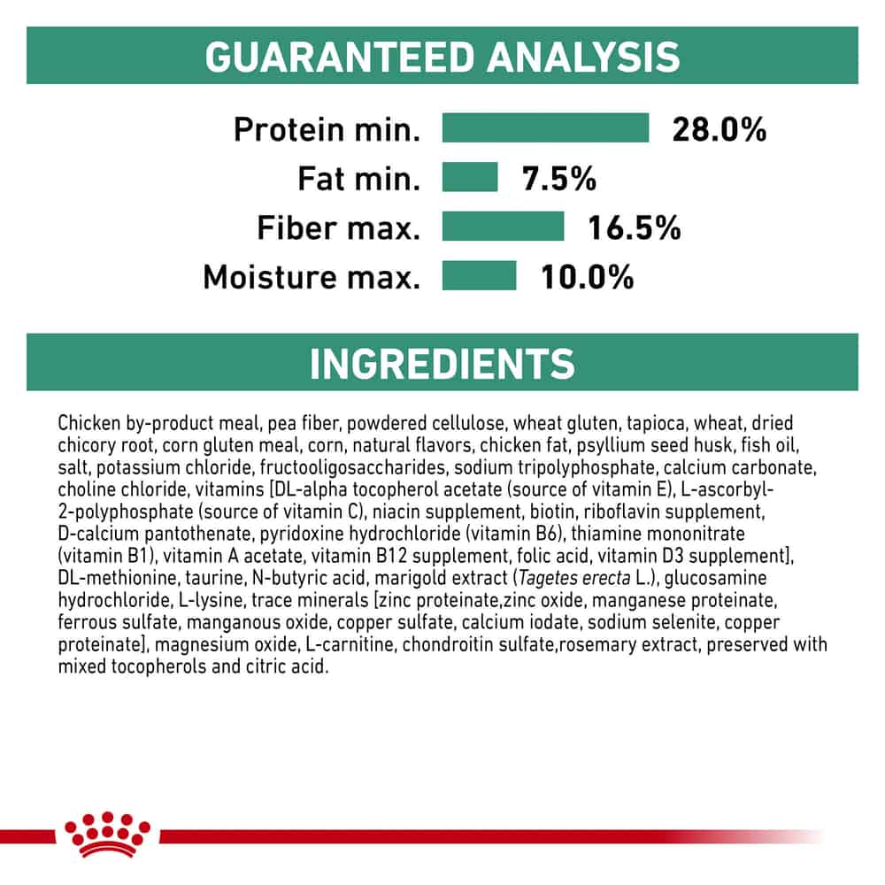 | Chicken by-product meal, pea fiber, powdered cellulose, wheat gluten, tapioca, wheat, dried chicory root, corn gluten meal, corn, natural flavors, chicken fat, psyllium seed husk, fish oil, salt, potassium chloride, fructooligosaccharides, sodium tripolyphosphate, calcium carbonate, choline chloride, vitamins [DL-alpha tocopherol acetate (source of vitamin E), L-ascorbyl-2-polyphosphate (source of vitamin C), niacin supplement, biotin, riboflavin supplement, D-calcium pantothenate, pyridoxine hydrochloride (vitamin B6), thiamine mononitrate (vitamin B1), vitamin A acetate, vitamin B12 supplement, folic acid, vitamin D3 supplement], DL-methionine, taurine, N-butyric acid, marigold extract (Tagetes erecta L.), glucosamine hydrochloride, L-lysine, trace minerals [zinc proteinate, zinc oxide, manganese proteinate, ferrous sulfate, manganous oxide, copper sulfate, calcium iodate, sodium selenite, copper proteinate], magnesium oxide, L-carnitine, chondroitin sulfate, rosemary extract, preserved with mixed tocopherols and citric acid. |