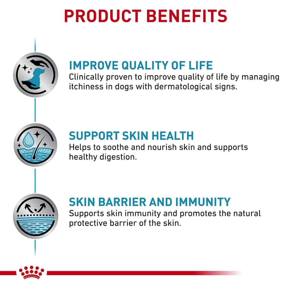 - When feeding Dry + Wet, this food is best mixed with Royal Canin Veterinary Diet Canine Skintopic Loaf in Sauce Wet Dog Food.