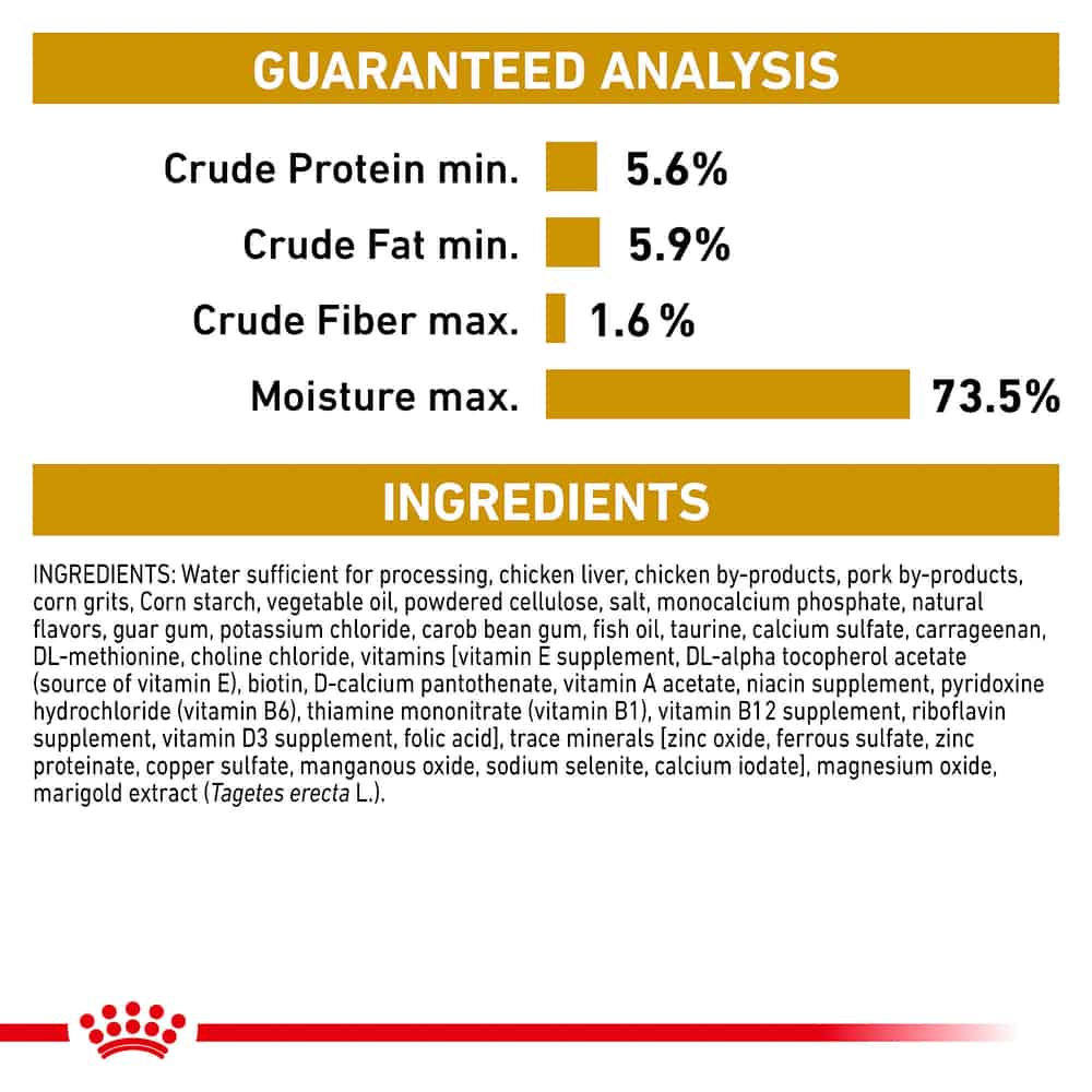Water sufficient for processing, chicken liver, chicken by-products, pork by-products, corn grits, Corn starch, vegetable oil, powdered cellulose, salt, monocalcium phosphate, natural flavors, guar gum, potassium chloride, carob bean gum, fish oil, taurine, calcium sulfate, carrageenan, DL-methionine, choline chloride, vitamins [vitamin E supplement, DL-alpha tocopherol acetate (source of vitamin E), biotin, D-calcium pantothenate, vitamin A acetate, niacin supplement, pyridoxine hydrochloride (vitamin B6), thiamine mononitrate (vitamin B1), vitamin B12 supplement, riboflavin supplement, vitamin D3 supplement, folic acid], trace minerals [zinc oxide, ferrous sulfate, zinc proteinate, copper sulfate, manganous oxide, sodium selenite, calcium iodate], magnesium oxide, marigold extract (Tagetes erecta L.).