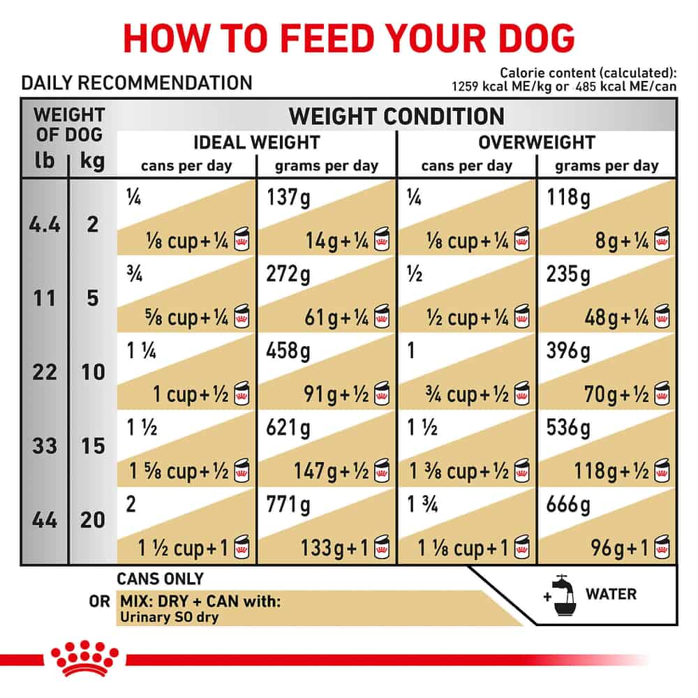 • When feeding Dry + Wet, this food is best mixed with Royal Canin Veterinary Diet Canine Urinary SO Dry Dog Food.