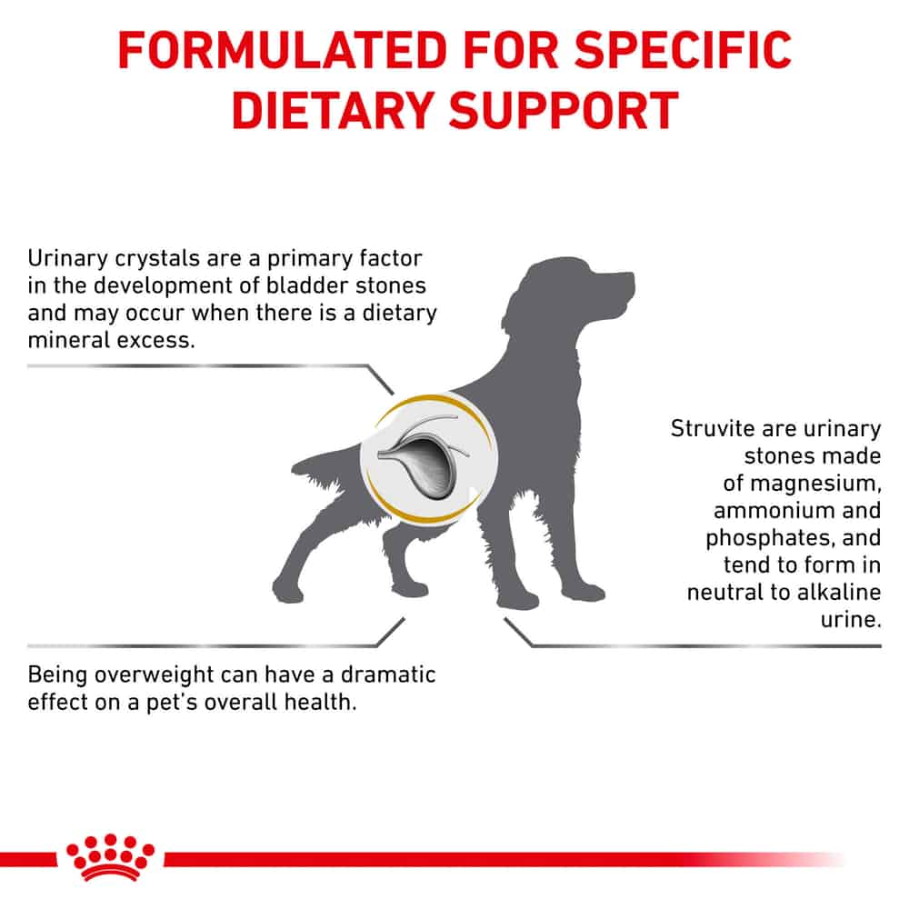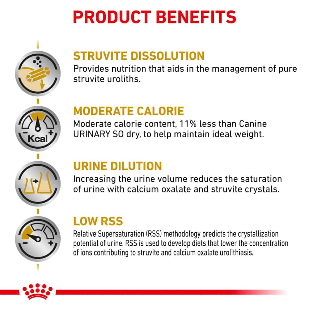 - When feeding Dry + Wet, this food is best mixed with Royal Canin Veterinary Diet Canine Urinary SO Moderate Calorie Thin Slices in Gravy Wet Dog Food.
