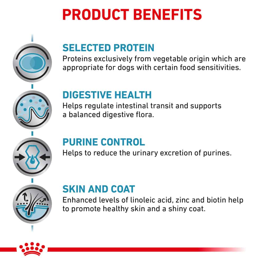 This highly palatable dry food formula contains select vegetable proteins to minimize the risk of triggering a reaction.Added linoleic acid, zinc, and biotin support healthy skin and a shiny coat. A specific nutrient blend promotes healthy digestion. And this diet helps reduce the urinary excretion of purines, a component of urate bladder stones. Ask your vet about feeding your adult dog Royal Canin Vegetarian wet dog food as a complement.