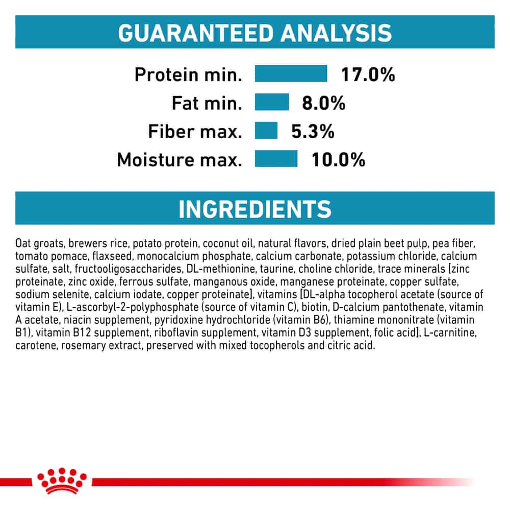 | Oat groats, brewers rice, potato protein, coconut oil, natural flavors, dried plain beet pulp, pea fiber, tomato pomace, flaxseed, monocalcium phosphate, calcium carbonate, potassium chloride, calcium sulfate, salt, fructooligosaccharides, DL-methionine, taurine, choline chloride, trace minerals [zinc proteinate, zinc oxide, ferrous sulfate, manganous oxide, manganese proteinate, copper sulfate, sodium selenite, calcium iodate, copper proteinate], vitamins [DL-alpha tocopherol acetate (source of vitamin E), L-ascorbyl-2-polyphosphate (source of vitamin C), biotin, D-calcium pantothenate, vitamin A acetate, niacin supplement, pyridoxine hydrochloride (vitamin B6), thiamine mononitrate (vitamin B1), vitamin B12 supplement, riboflavin supplement, vitamin D3 supplement, folic acid], L-carnitine, carotene, rosemary extract, preserved with mixed tocopherols and citric acid. |