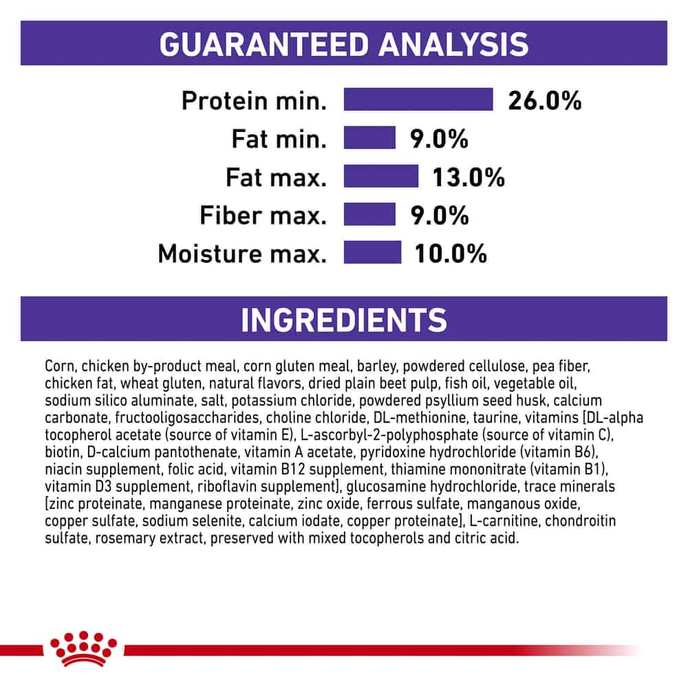| Corn, chicken by-product meal, corn gluten meal, barley, powdered cellulose, pea fiber, chicken fat, wheat gluten, natural flavors, dried plain beet pulp, fish oil, vegetable oil, sodium silico aluminate, salt, potassium chloride, powdered psyllium seed husk, calcium carbonate, fructooligosaccharides, choline chloride, DL-methionine, taurine, vitamins [DL-alpha tocopherol acetate (source of vitamin E), L-ascorbyl-2-polyphosphate (source of vitamin C), biotin, D-calcium pantothenate, vitamin A acetate, pyridoxine hydrochloride (vitamin B6), niacin supplement, folic acid, vitamin B12 supplement, thiamine mononitrate (vitamin B1), vitamin D3 supplement, riboflavin supplement], glucosamine hydrochloride, trace minerals [zinc proteinate, manganese proteinate, zinc oxide, ferrous sulfate, manganous oxide, copper sulfate, sodium selenite, calcium iodate, copper proteinate], L-carnitine, chondroitin sulfate, rosemary extract, preserved with mixed tocopherols and citric acid. |