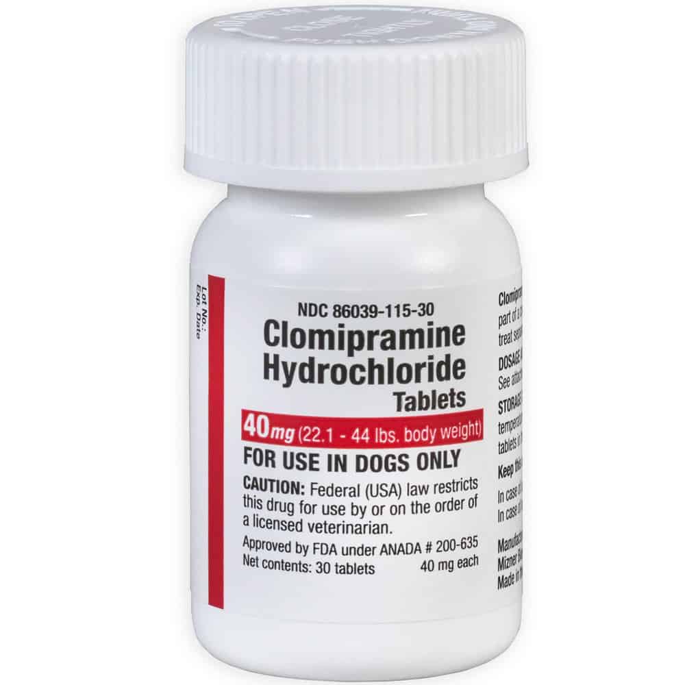 Clomipramine Hydrochloride Tablets belong to the dibenzazepine class of tricyclic antidepressants. Clomipramine hydrochloride reduces the clinical signs of separation anxiety. Inappropriate barking or destructive behavior, as well as inappropriate elimination (urination or defecation) may be alleviated by the use of Clomipramine Hydrochloride Tablets in conjunction with behavior modification. The tablets are beef flavored to make administration easy. Scored for accurate dosing. For use in dogs older than 6 months of age. It can be used as part of a comprehensive behavior management program.