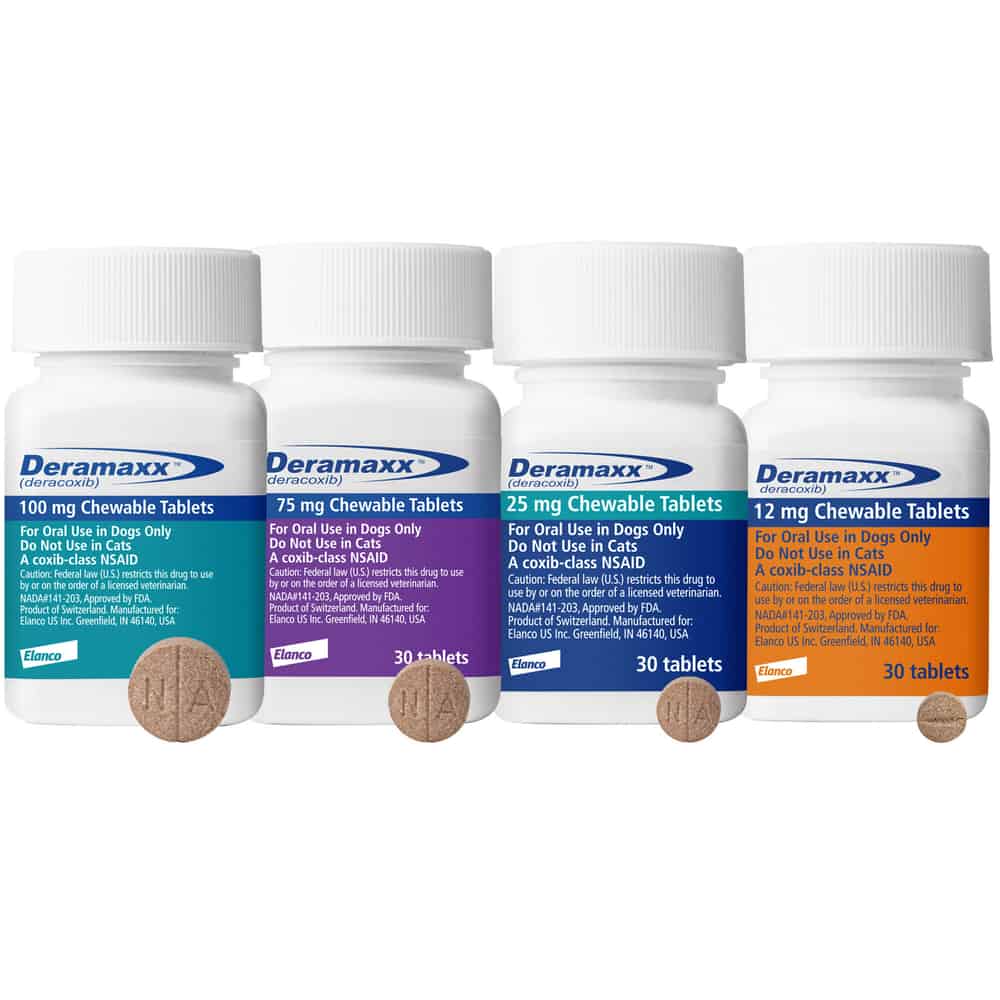Deramaxx is a prescription medication that is FDA approved for use in dogs. Deramaxx is available as 12 mg, 25 mg, 75 mg, and 100 mg chewable, scored tablets. All dogs should undergo a thorough history and physical examination before using Deramaxx. Regular monitoring is recommended. Contact your veterinarian if your pet has hives or an allergic reaction after taking sulfa-based medications such as SMZ/TMP, aspirin, or another NSAID such as Rimadyl. Notify your veterinarian immediately if your pet develops or experiences any of the following: abdominal pain, tenderness or discomfort, nausea, bloody, black, or tarry stools, fatigue or lethargy, a skin rash, itching, yellowing of the eyes, or unusual bruising or bleeding as these symptoms could be early signs of dangerous side effects. Before giving your pet any prescription or over-the-counter medications, check with your veterinarian or pharmacist. See Deramaxx label for complete safety information.