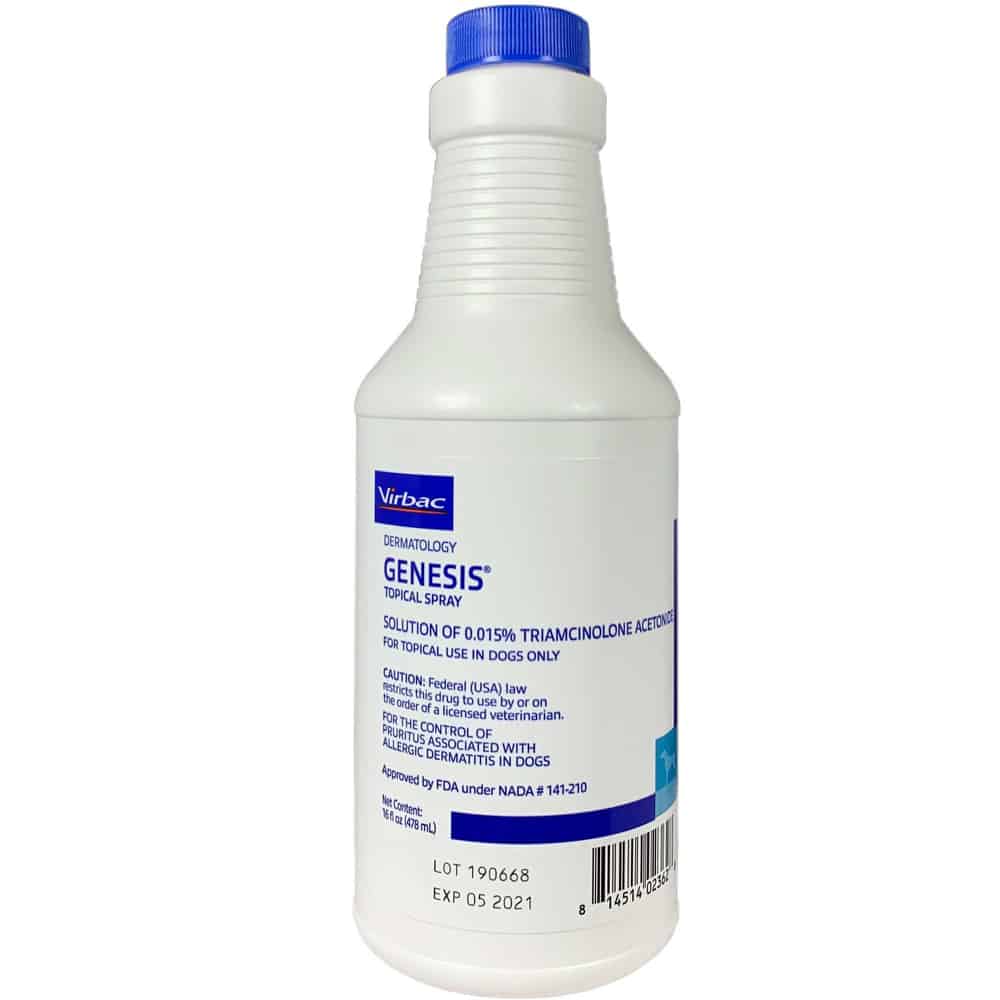 Genesis Topical Spray is a topical corticosteroid used for the control of itching associated with allergy dermatitis. Genesis Topical Spray may also be used for purposes other than those listed here. Genesis Topical Spray is a prescription medication FDA-approved for use on dogs weighing at least 8 lbs and at least 1 year old. Do not get Genesis Topical Spray in your pet's eyes. Use only in a well-ventilated area and wear gloves when applying the medication.