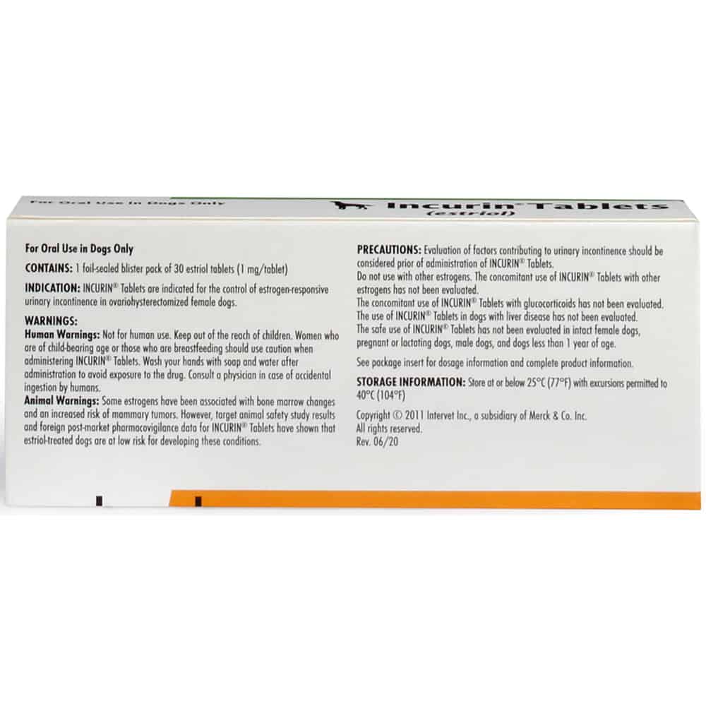 Incurin (estriol) Tablets are used for the treatment and control of urinary incontinence that is estrogen-responsive for female dogs that have undergone ovariohysterectomy (surgical removal of the ovaries & uterus).