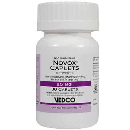 Novox is a prescription medication that is FDA approved for use in dogs. Novox is available as 25 mg, 75 mg and 100 mg capsule shaped scored non-chewable caplets, and as 25 mg, 75 mg and 100 mg liver-flavored scored chewable tablets. The usual total daily dose in dogs is 2 mg per pound given as a single daily dose or divided and administered as 1 mg per pound twice a day. Contact the veterinarian if your pet has bloody, black or tarry stools as these symptoms could indicate damage to the stomach or intestines, which could be dangerous. As with all prescribed medicines, Novox Carprofen should only be given to the dog for which it was prescribed. It should be given to your dog only for the condition for which it was prescribed. It is important to periodically discuss your dog's response to Novox Carprofen at regular check ups. Your veterinarian will best determine if your dog is responding as expected and if your dog should continue receiving Novox Carprofen. Before giving your pet any prescription or over the counter medications, check with your veterinarian or pharmacist.
