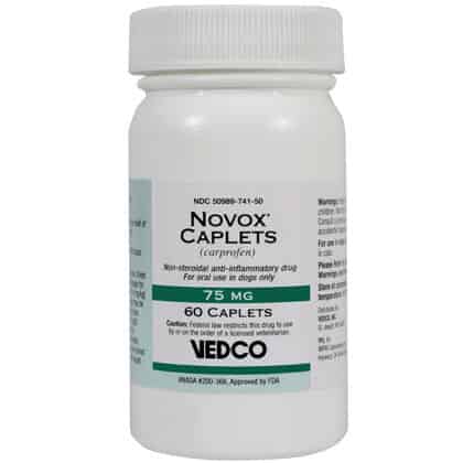 Novox is a prescription medication that is FDA approved for use in dogs. Novox is available as 25 mg, 75 mg and 100 mg capsule shaped scored non-chewable caplets, and as 25 mg, 75 mg and 100 mg liver-flavored scored chewable tablets. The usual total daily dose in dogs is 2 mg per pound given as a single daily dose or divided and administered as 1 mg per pound twice a day. Contact the veterinarian if your pet has bloody, black or tarry stools as these symptoms could indicate damage to the stomach or intestines, which could be dangerous. As with all prescribed medicines, Novox Carprofen should only be given to the dog for which it was prescribed. It should be given to your dog only for the condition for which it was prescribed. It is important to periodically discuss your dog's response to Novox Carprofen at regular check ups. Your veterinarian will best determine if your dog is responding as expected and if your dog should continue receiving Novox Carprofen. Before giving your pet any prescription or over the counter medications, check with your veterinarian or pharmacist.