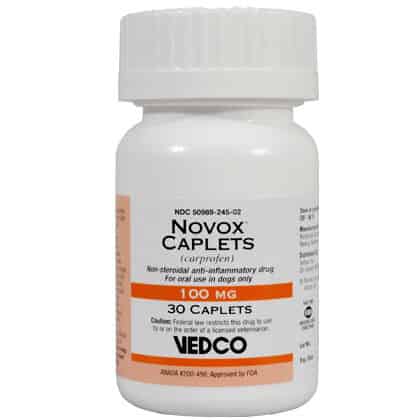 Novox is a prescription medication that is FDA approved for use in dogs. Novox is available as 25 mg, 75 mg and 100 mg capsule shaped scored non-chewable caplets, and as 25 mg, 75 mg and 100 mg liver-flavored scored chewable tablets. The usual total daily dose in dogs is 2 mg per pound given as a single daily dose or divided and administered as 1 mg per pound twice a day. Contact the veterinarian if your pet has bloody, black or tarry stools as these symptoms could indicate damage to the stomach or intestines, which could be dangerous. As with all prescribed medicines, Novox Carprofen should only be given to the dog for which it was prescribed. It should be given to your dog only for the condition for which it was prescribed. It is important to periodically discuss your dog's response to Novox Carprofen at regular check ups. Your veterinarian will best determine if your dog is responding as expected and if your dog should continue receiving Novox Carprofen. Before giving your pet any prescription or over the counter medications, check with your veterinarian or pharmacist.