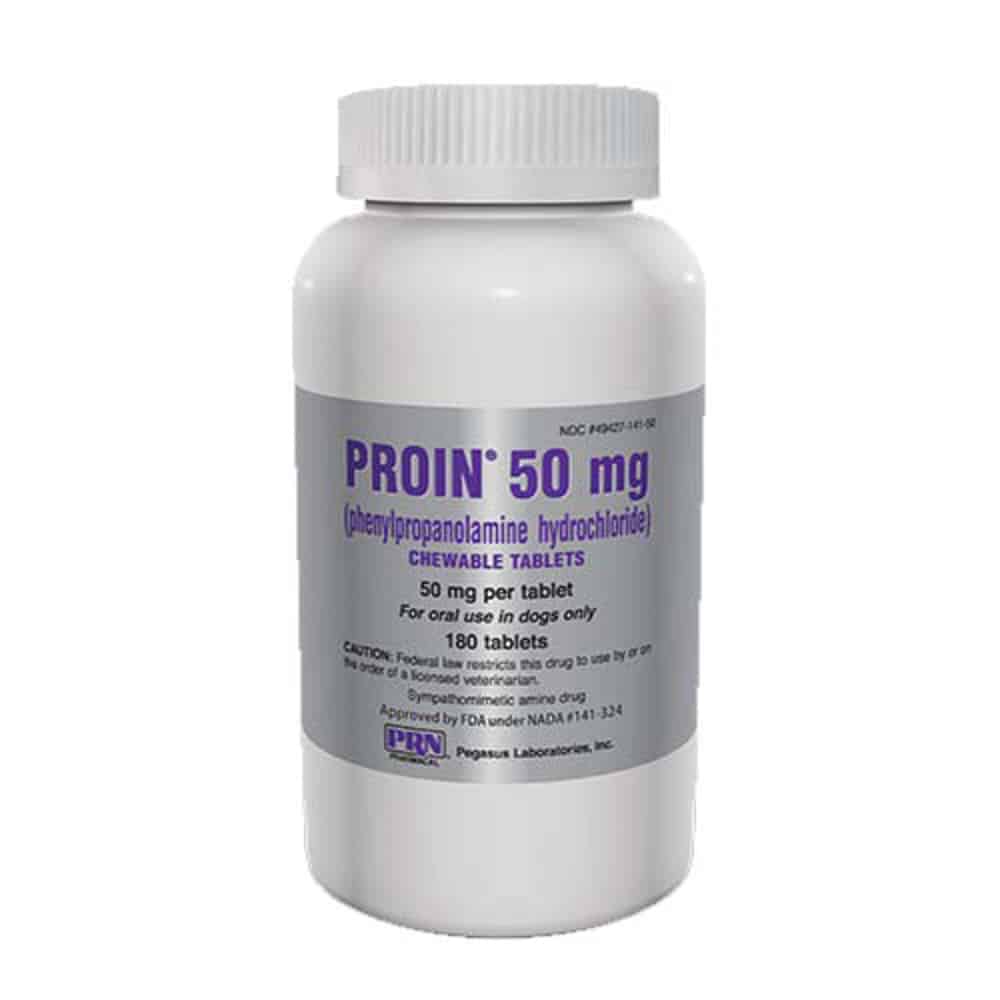 Proin is a prescription medication for veterinary use in dogs. Proin is available as 25mg, 50mg and 75mg chewable, liver flavor tablets. Proin may cause restlessness, irritability, or loss of appetite.
