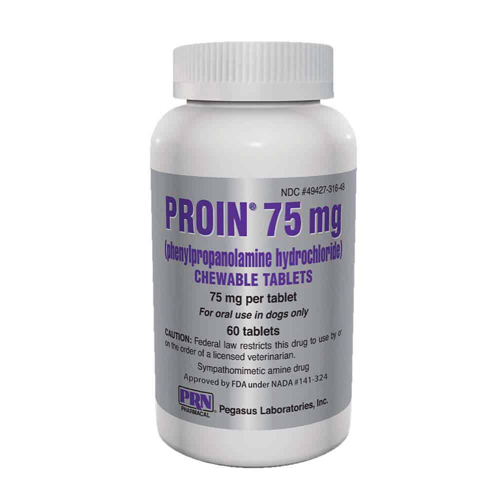 Proin is a prescription medication for veterinary use in dogs. Proin is available as 25mg, 50mg and 75mg chewable, liver flavor tablets. Proin may cause restlessness, irritability, or loss of appetite.