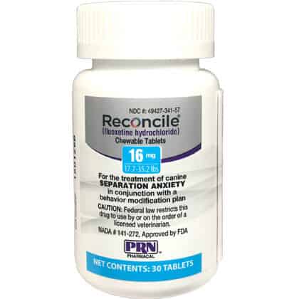 This is a chewable tablet used alongside a behavior modification plan to treat separation anxiety in dogs. It works by increasing serotonin levels in the brain to help your dog stay calm when left alone. It requires a prescription from your veterinarian, and is available in 8 mg, 32 mg, and 64 mg strengths. Reconcile does not act as a sedative.