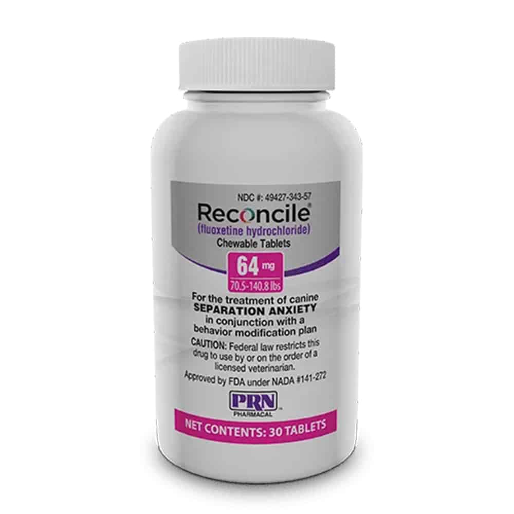 This is a chewable tablet used alongside a behavior modification plan to treat separation anxiety in dogs. It works by increasing serotonin levels in the brain to help your dog stay calm when left alone. It requires a prescription from your veterinarian, and is available in 8 mg, 32 mg, and 64 mg strengths. Reconcile does not act as a sedative.